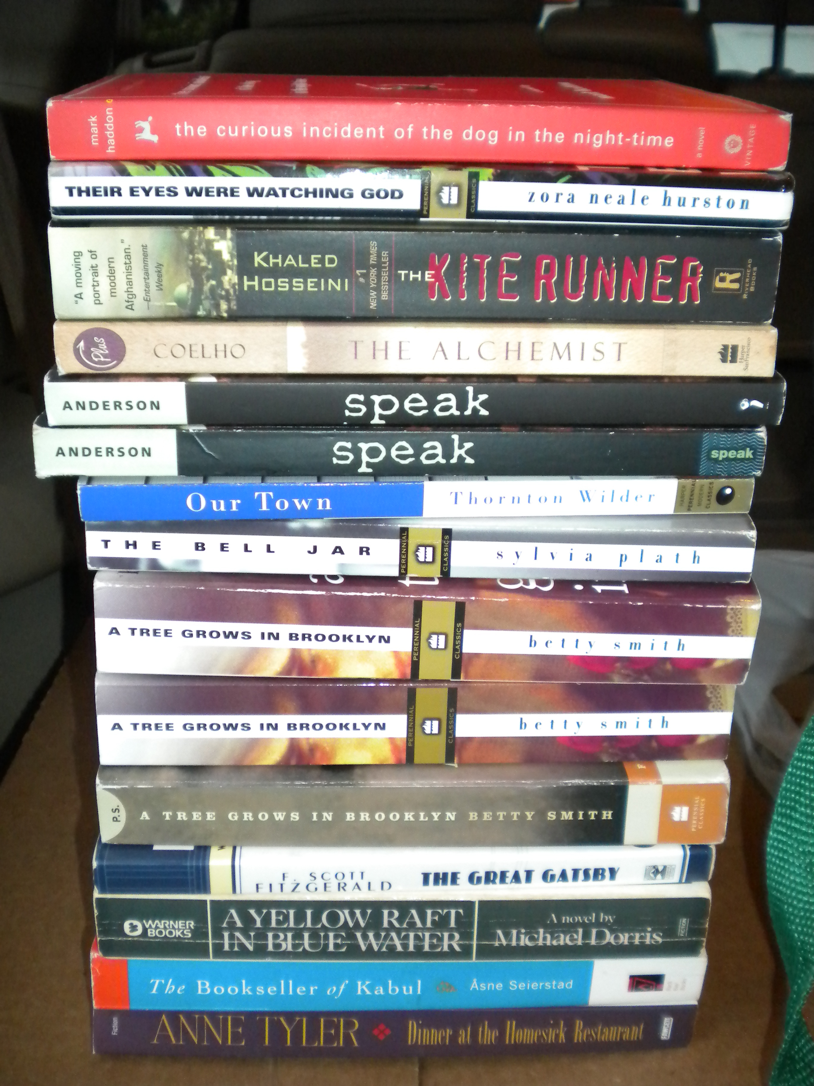 There were many good books at the sale that I can add to the classroom libraries. There were three new copies of A Tree Grows in Brooklyn by Betty Smith, a copy of Yellow Raft in Blue Water by Michael Dorris, and a copy of Anne Tyler’s Dinner at the Homesick Restaurant for independent reading by juniors. There were also copies of books that we teach including: