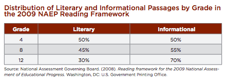 The CCSS suggest a decreasing ratio of fiction  to an increasing ratio of informational texts  for students in grade 4, grade 8, and grade 12. (see chart) This does not mean that English/Language Arts classes must drop literary fiction, but that other disciplines (History/Social Studies, Math, Science, Health, etc) should include more informational texts in their instruction in order to achieve the suggested ratios. The London 2012 Opening Ceremony was a blend of information and fiction (literally!).