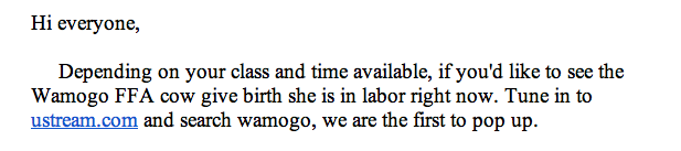“[WamogoAll] If you want to see our cow give birth right now..” was the tagline for the e-mail in my in box last Thursday afternoon. I teach in a “Ag-ed” or agricultural education school in the Northwestern Corner of Connecticut, so the contents in the e-mail were not surprising: