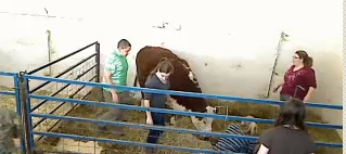 I paid closer attention to the video monitor as the noise from the barn came over the computer’s speaker. I watched as students gathered around the stall, and then saw Lori, the animal science teacher, jump in to calm the cow and rearrange the straw for bedding. Suddenly, three or four students and the culinary arts teacher formed a line behind the cow, and in an unrehearsed routine, began helping Lori with the birth. I took a screen shot.