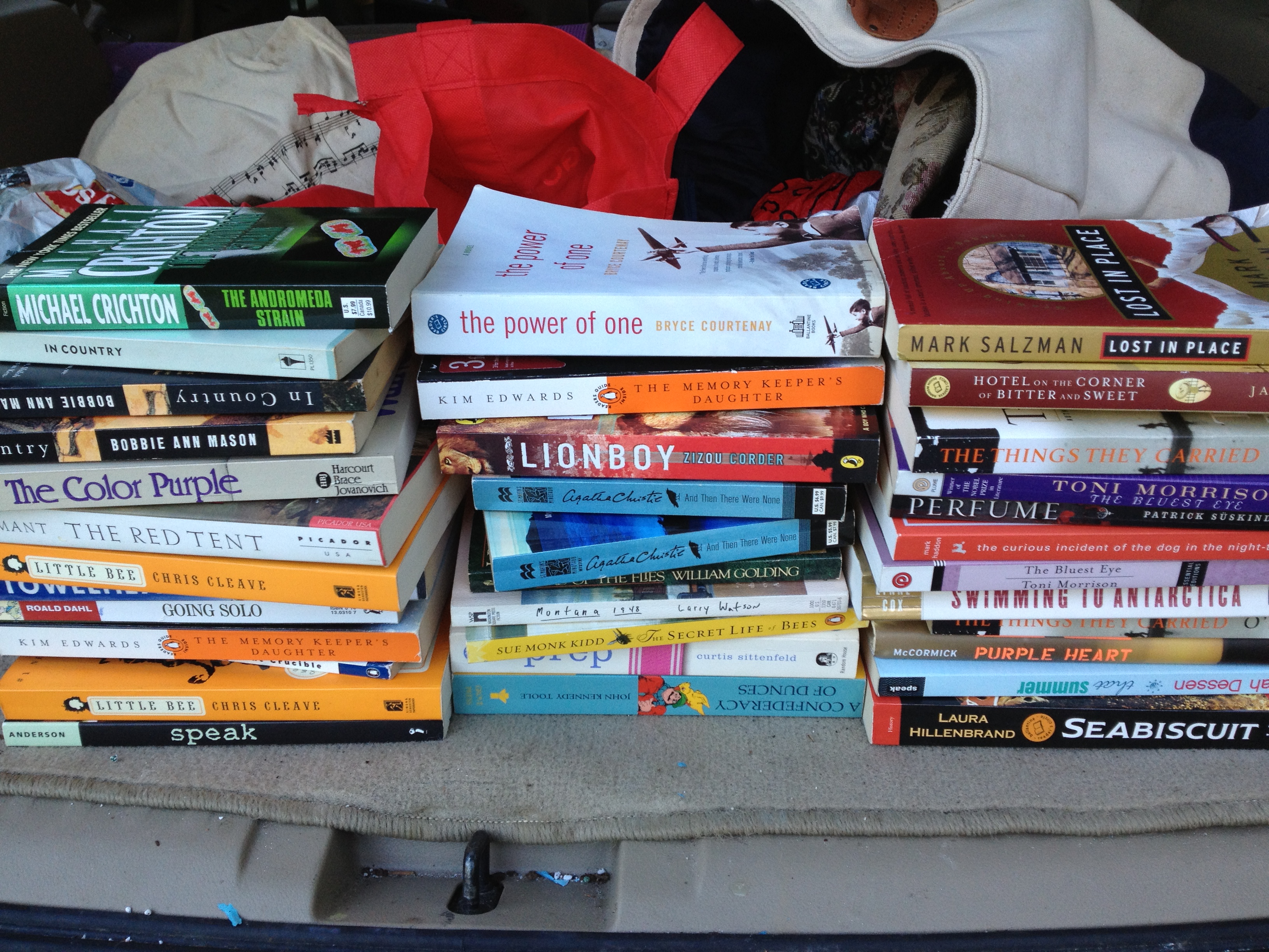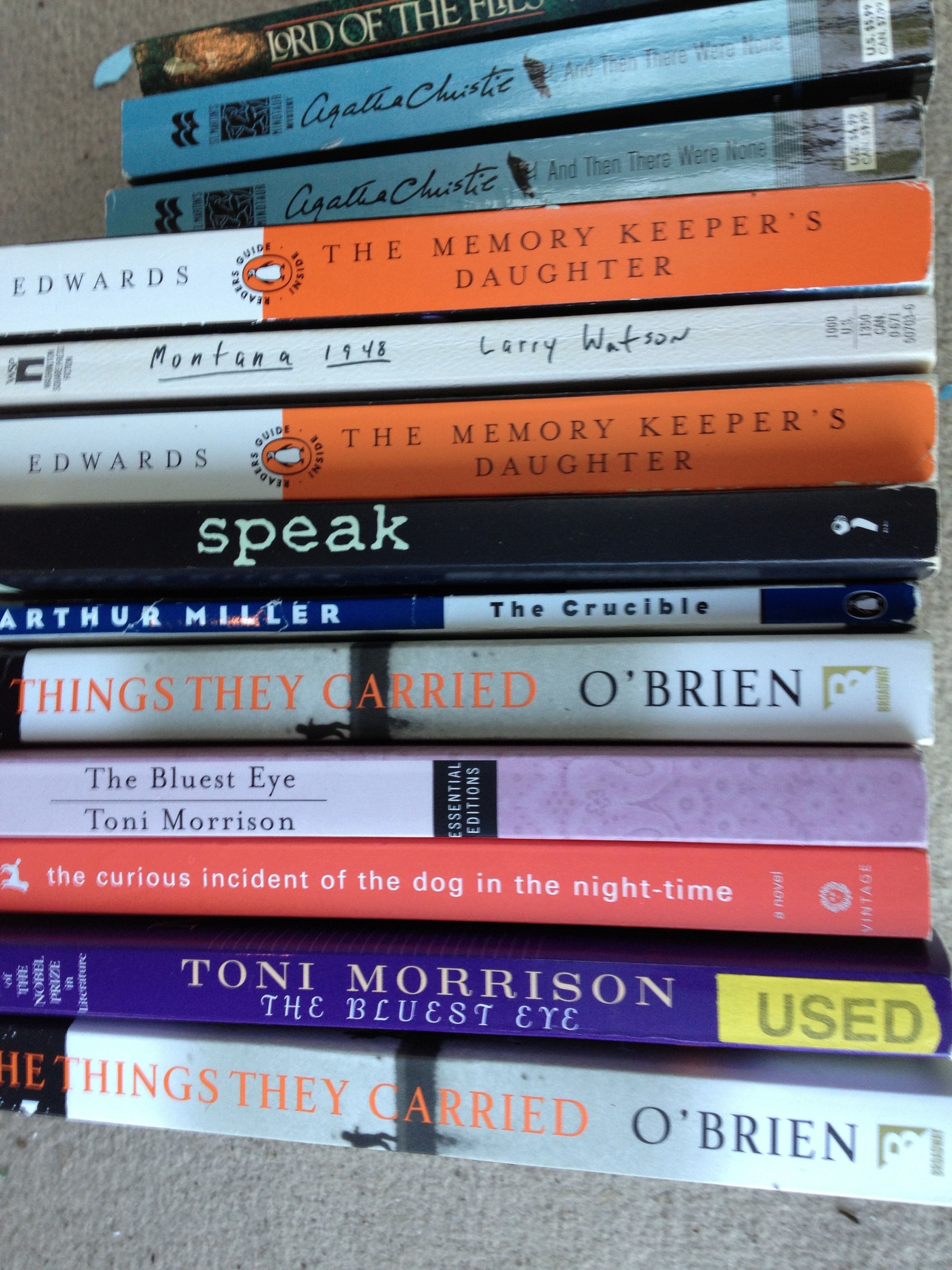 On the tables I grabbed titles we offer in our Grade 11 Vietnam War literature unit: 3 copies of In Country by Bobbie Ann Mason and and 2 copies of Tim O’Brien’s The Things They Carried.  There were also books assigned in our curriculum for Grade 10 World Literature: Mark Haddon’s The Curious Incident of the Dog in the Night Time and William Golding’s Lord of the Flies. Finally, two clean copies of Agatha Christie’s And Then There Were None will be placed in our grade 8 mystery unit. Summer reading for the Advanced Placement English Language is Kim Edward’s The Memory Keeper’s Daughter while Toni Morrison’s The Bluest Eye is one of the choices offered to these students during the school year.