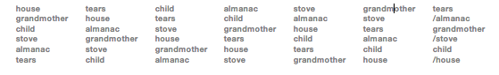 The pattern above looks to me like sets of algebraic equations, and I mentioned that when I passed out copies of the sestina by Elizabeth Bishop titled, appropriately enough, “Sestina.”