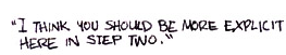 Under the cartoon is the caption spoken by one of the mathematicians: “I think you need to be a little more explicit here in step two.”
